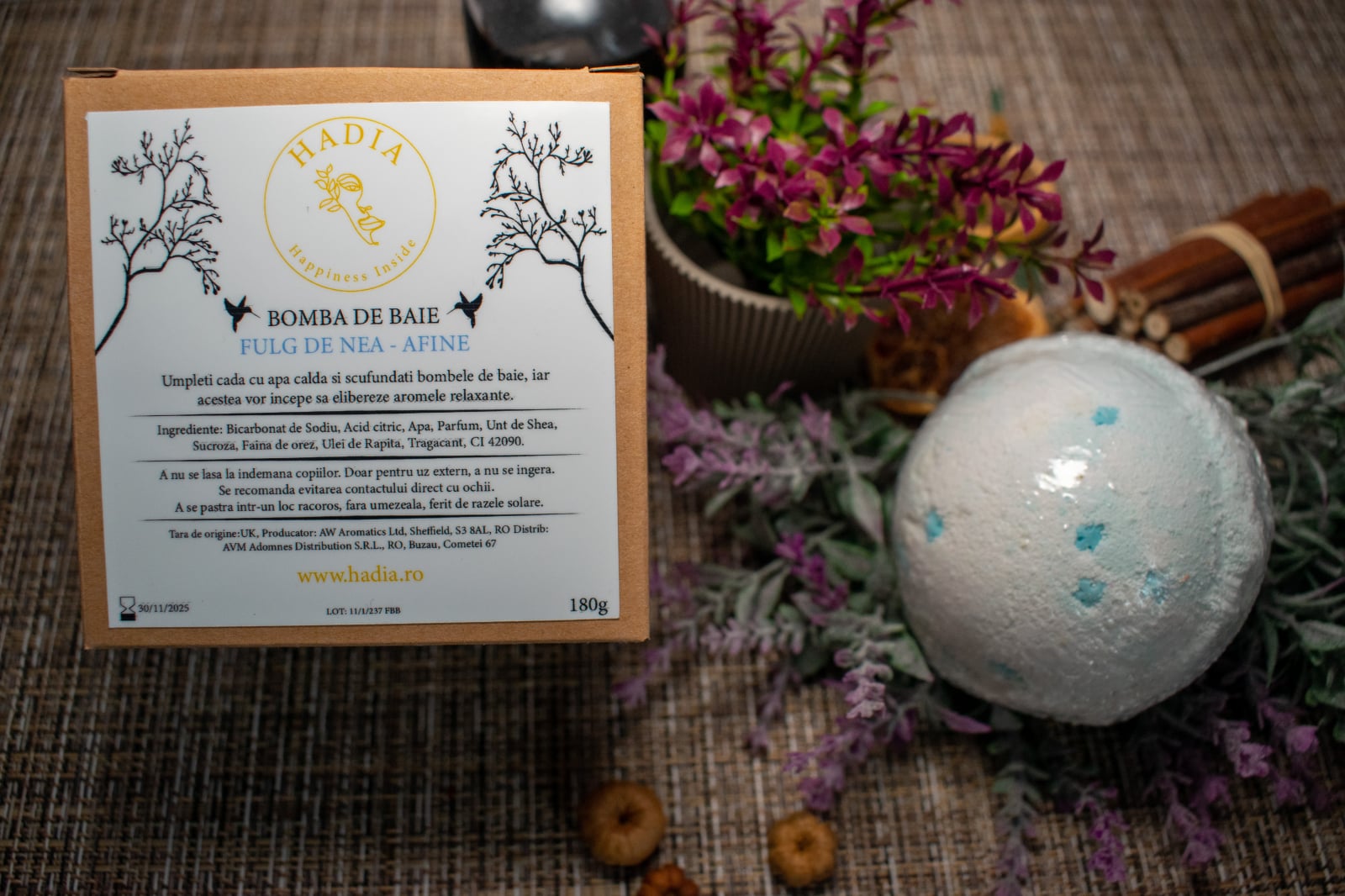 Ingrediente Fulg De Nea-Afine: Ingrediente: Bicarbonat de sodiu, Acid citric, Apa, Parfum, Unt de Shea, Sucroza, Faina de orez, Ulei de Rapita, Ulei de Floarea Sorelui, Tragacant, CI 42090.