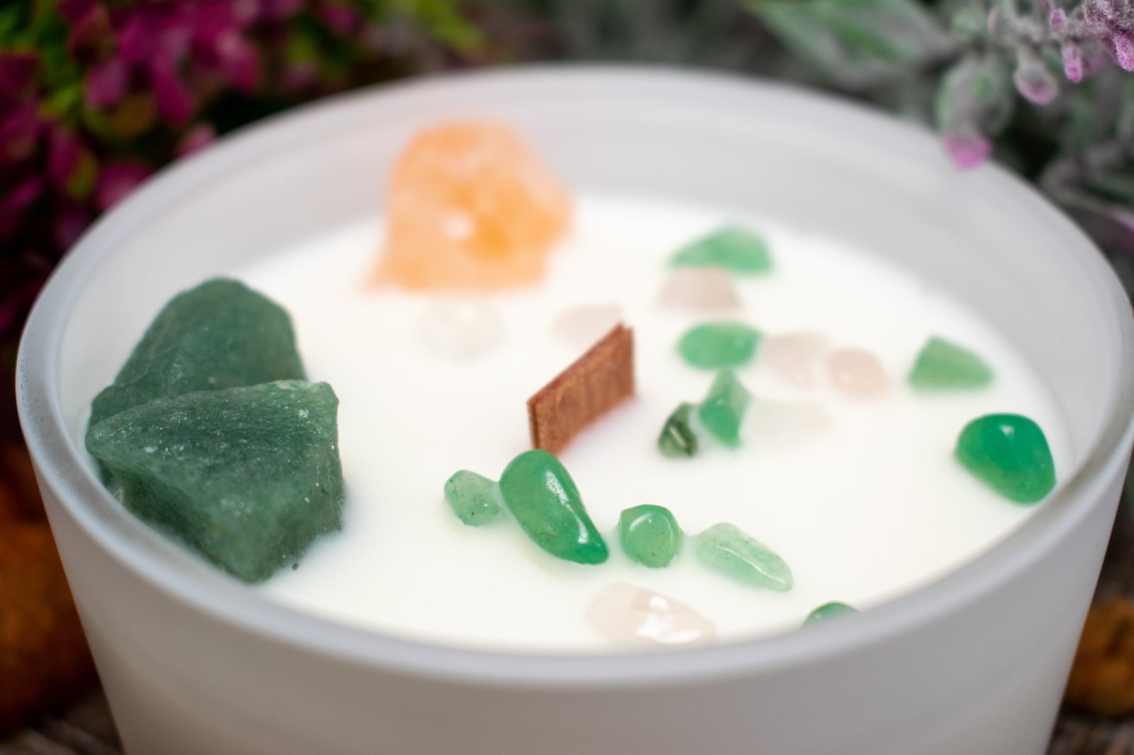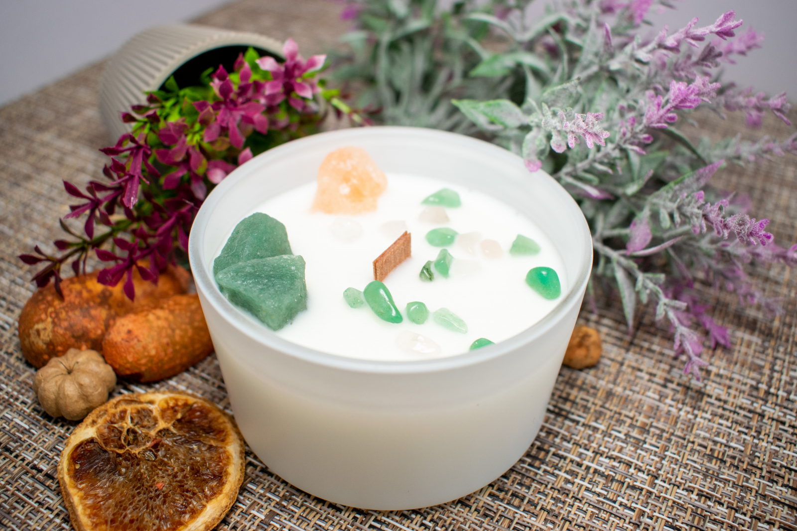 Ingrediente Chakra coroanei: Ceara de soia , cristale: celestită și selenit, lemn, sticla