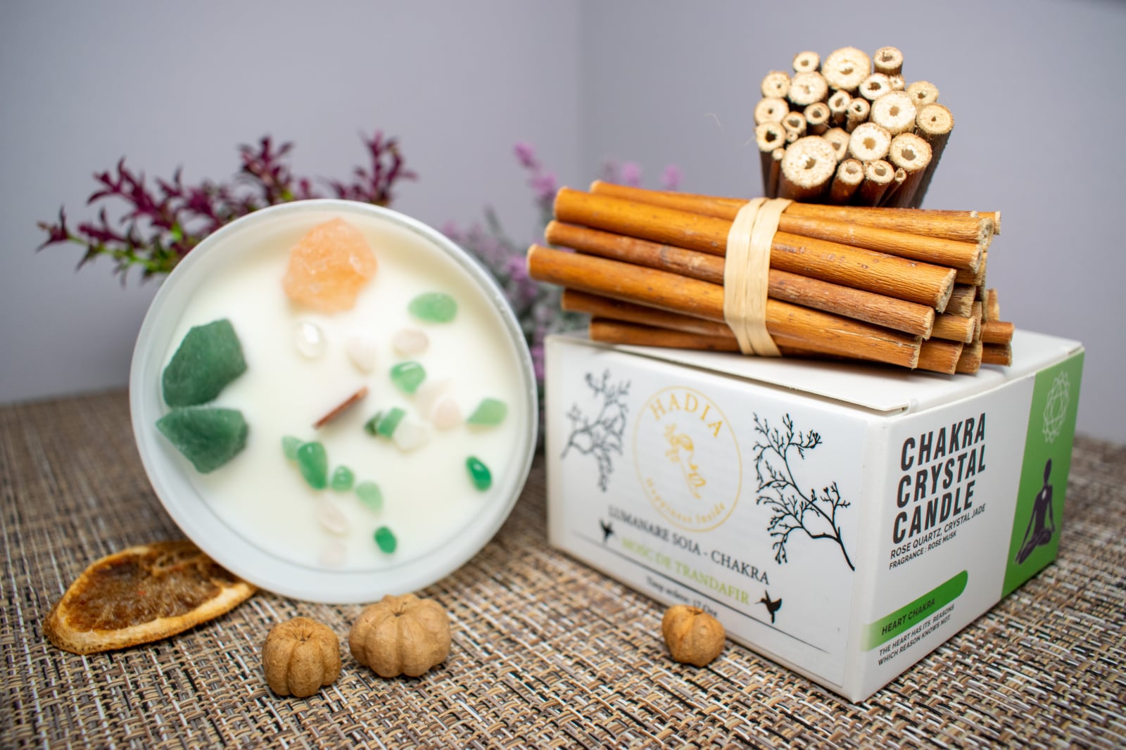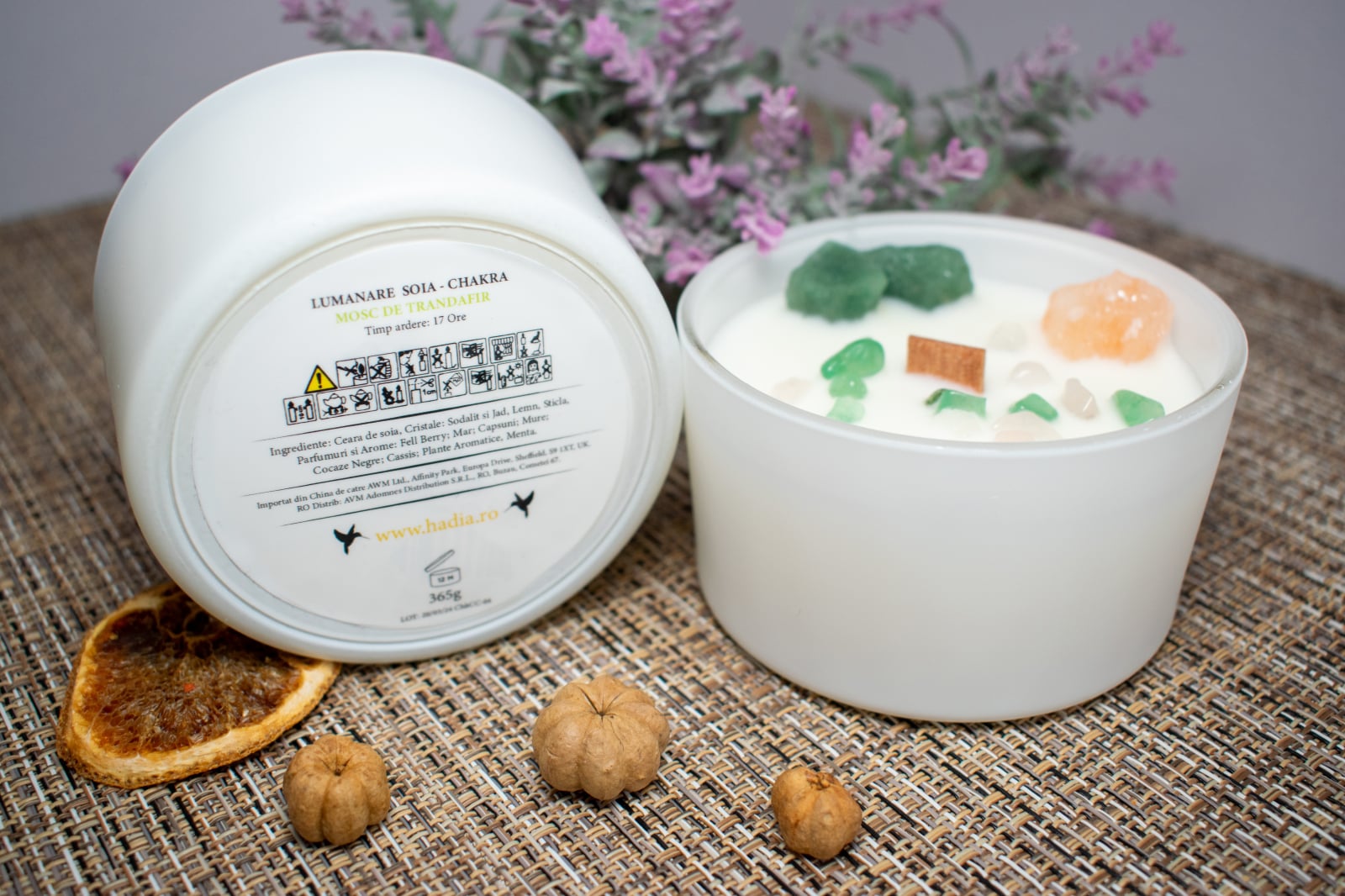 Ingrediente Chakra Inimii: Ceara de soia , cristale: Sodalit si Jad, lemn, sticla