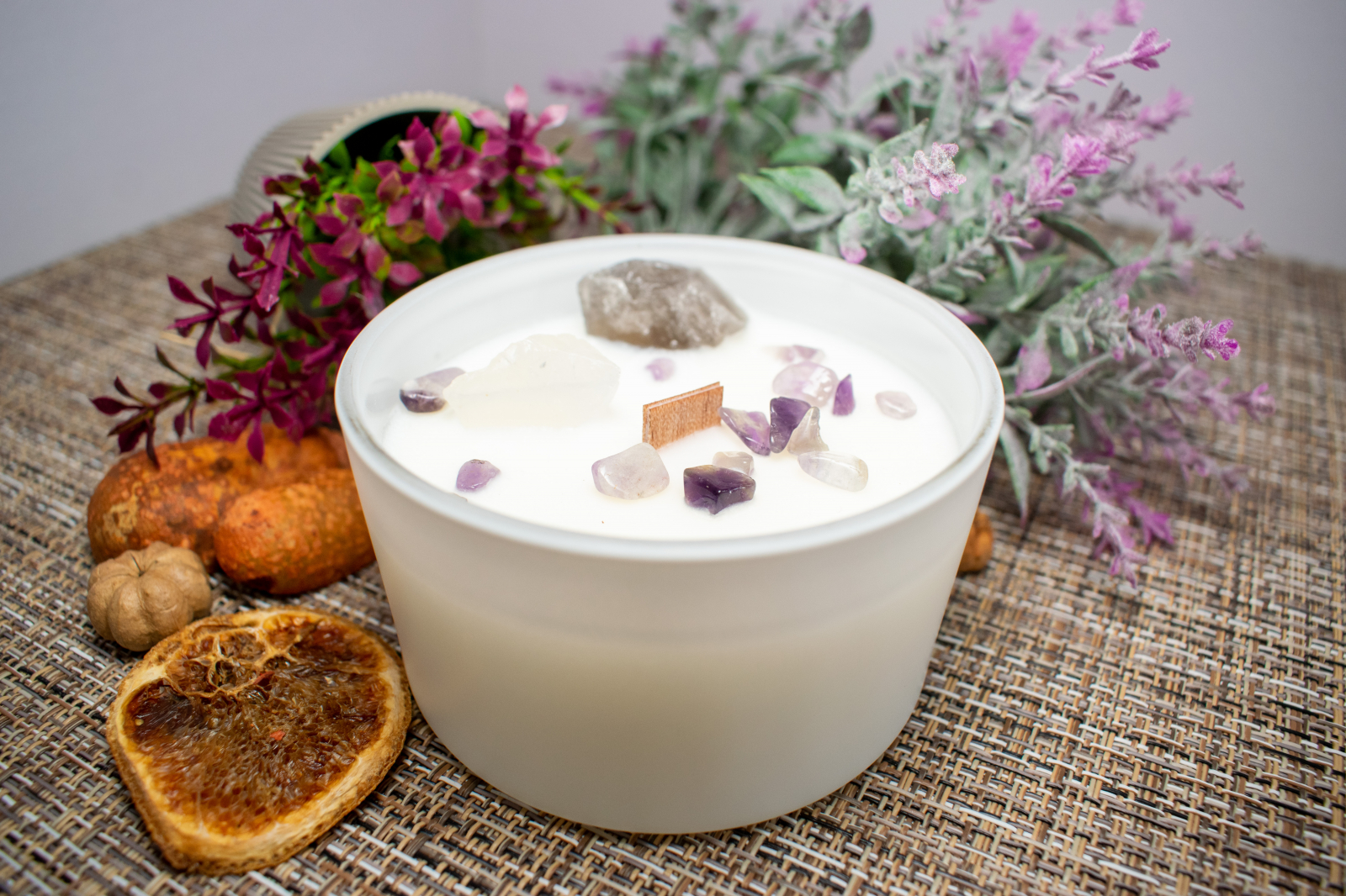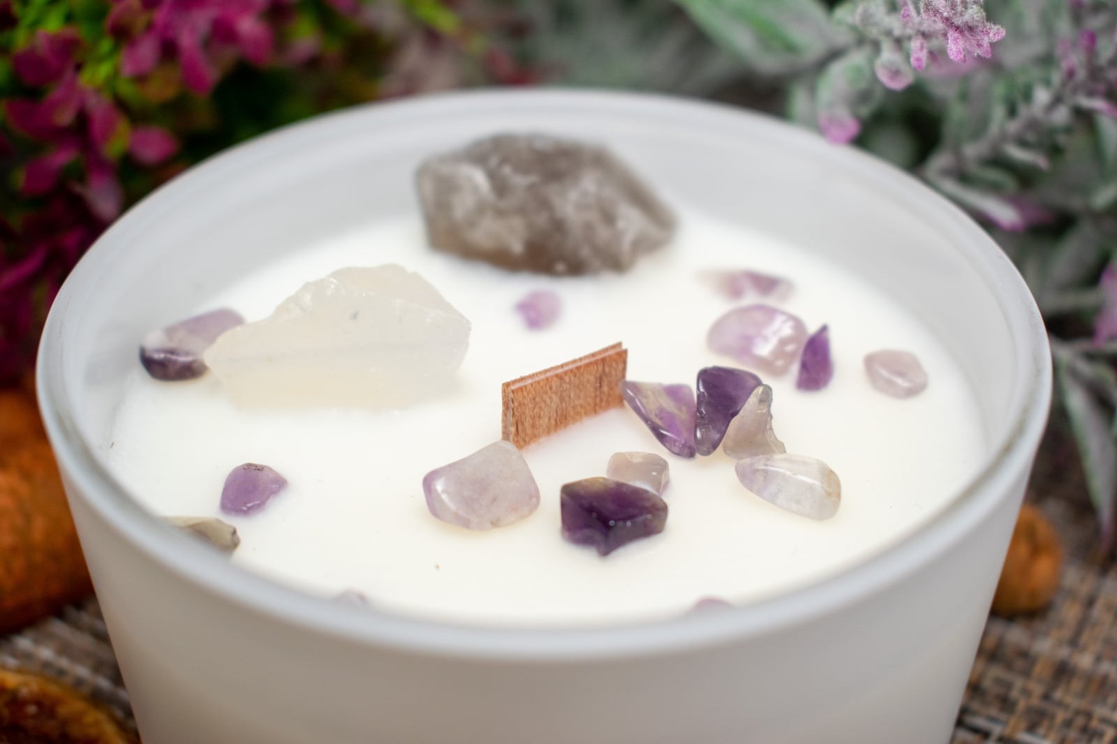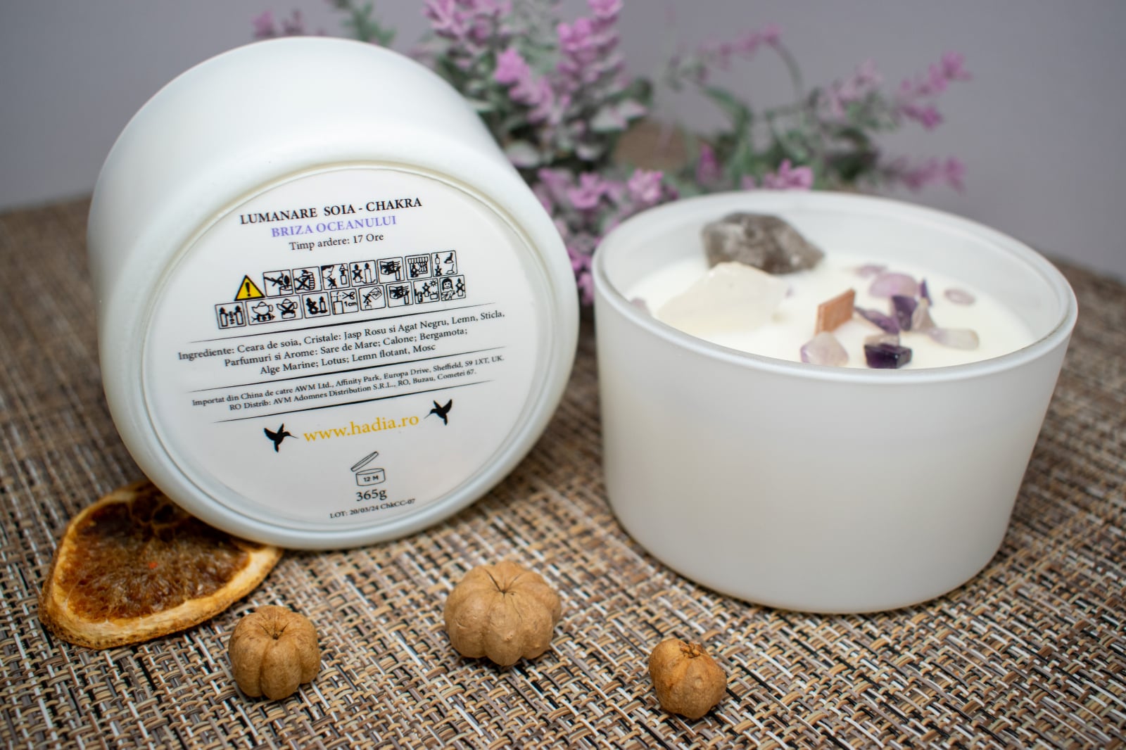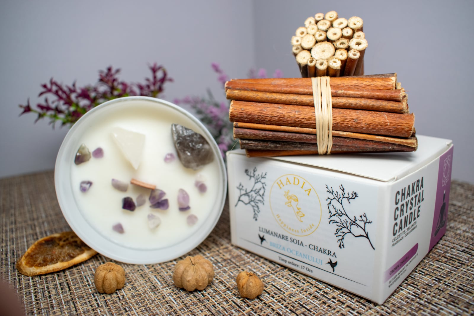 Ingrediente Chakra coroanei: Ceara de soia , cristale: celestită și selenit, lemn, sticla